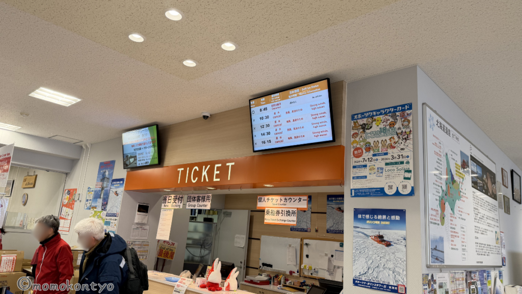 チケットカウンターで乗船券をゲット、流氷シーズンは満席になる可能性もある。