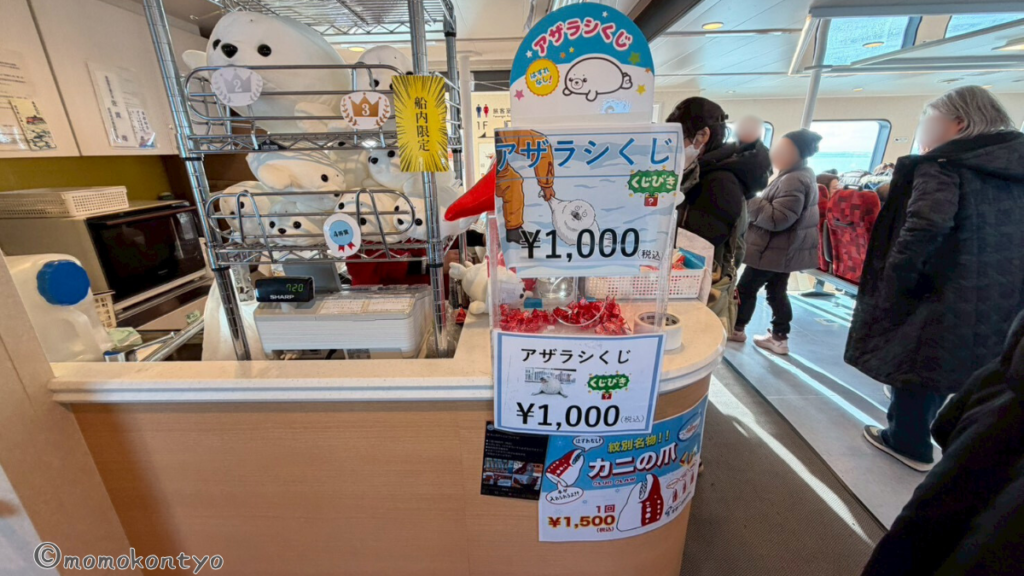 船内の売店にはアザラシくじが、、、!やりたいが荷物が増えるのでぐっとこらえる。